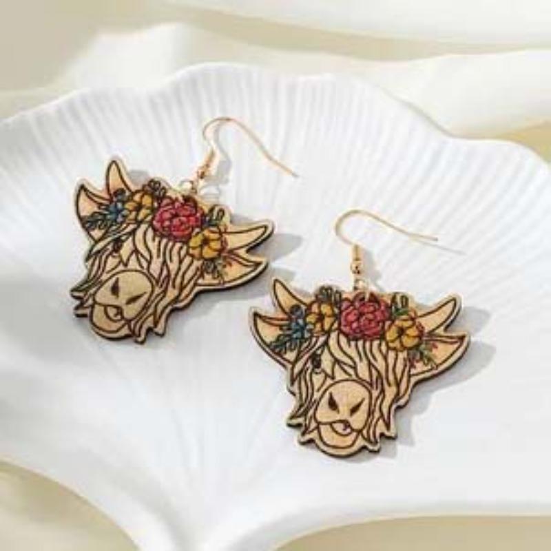 Ohrringe im Western-Denim-Stil mit Holzaufdruck Kuhkopf, modische und kreative Cartoon-Damenohrringe.