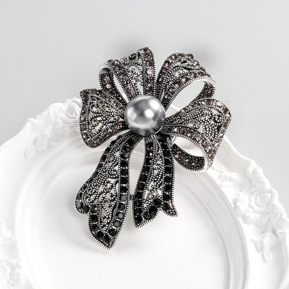 Vintage Fully-rhinestone Pin Corsage Ornament Black Brooch Exquisite Bow Brooch Women