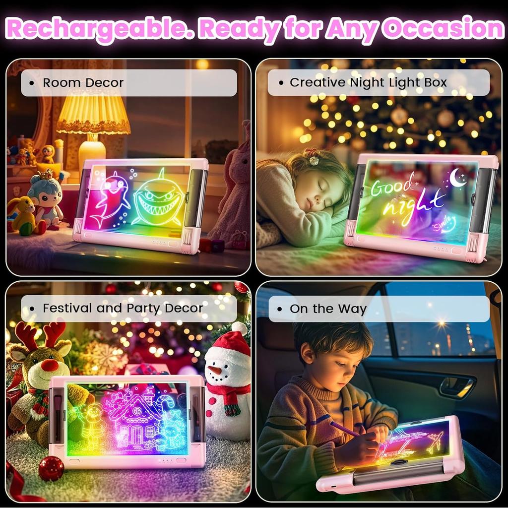 [Versatile LED Drawing Board]-: Enjoy 9 dazzling neon color effects, a built-in stand, 2 pen storage compartments, and a detachable magnetic dry erase board that doubles as a lightbox to showcase your child's creations. It can also be used as a message board, drawing board, or a lightbox as room decor
