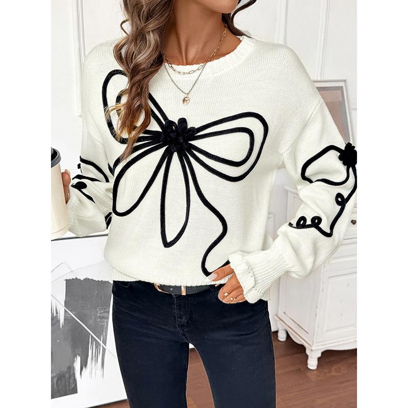 Elegant Tops for Women Streetwear Autumn New Fashion Three-dimensional Bow Round-neck Long Sleeves Pullover Sweater