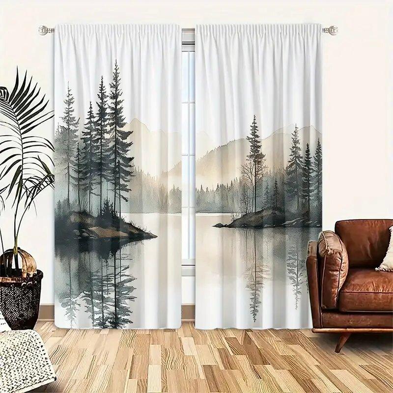 2 Stück - Vorhänge mit Aufdruck von Seelandschaftsmustern, Stangentaschenvorhänge, Heimdekoration, Raumdekoration