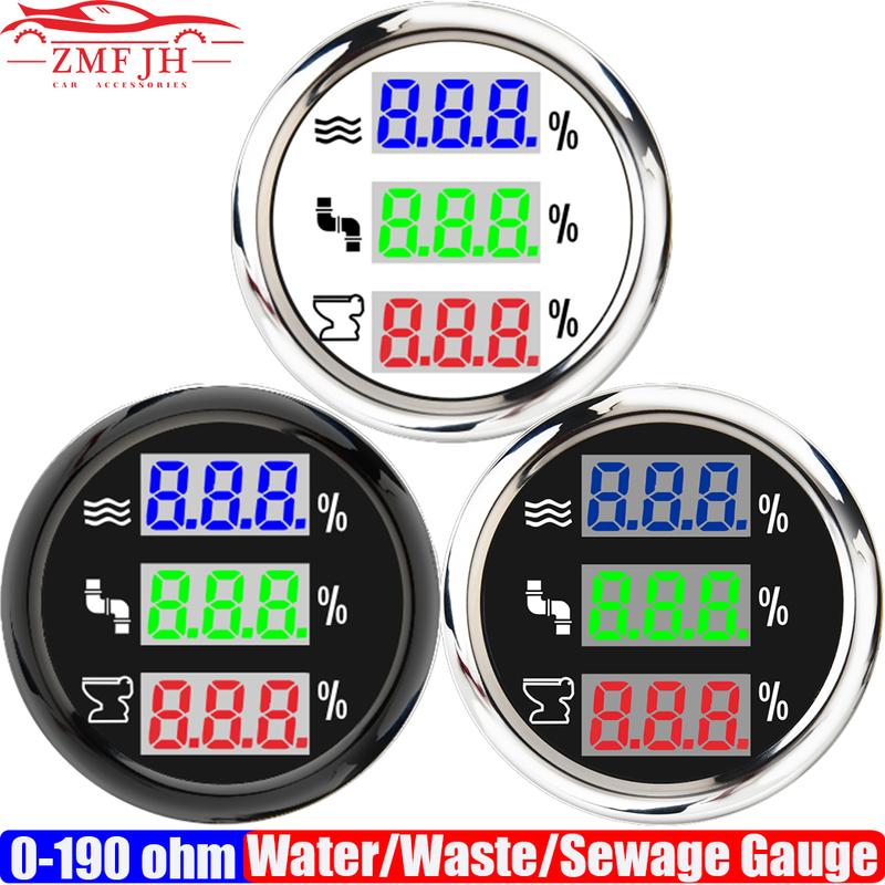 Digital 52mm Gauge 3 IN 1 Water/Waste/Sewage Level Gauge with Flash Alarm 0-190ohm Multi Meter Blue,Green,Red LED for Car