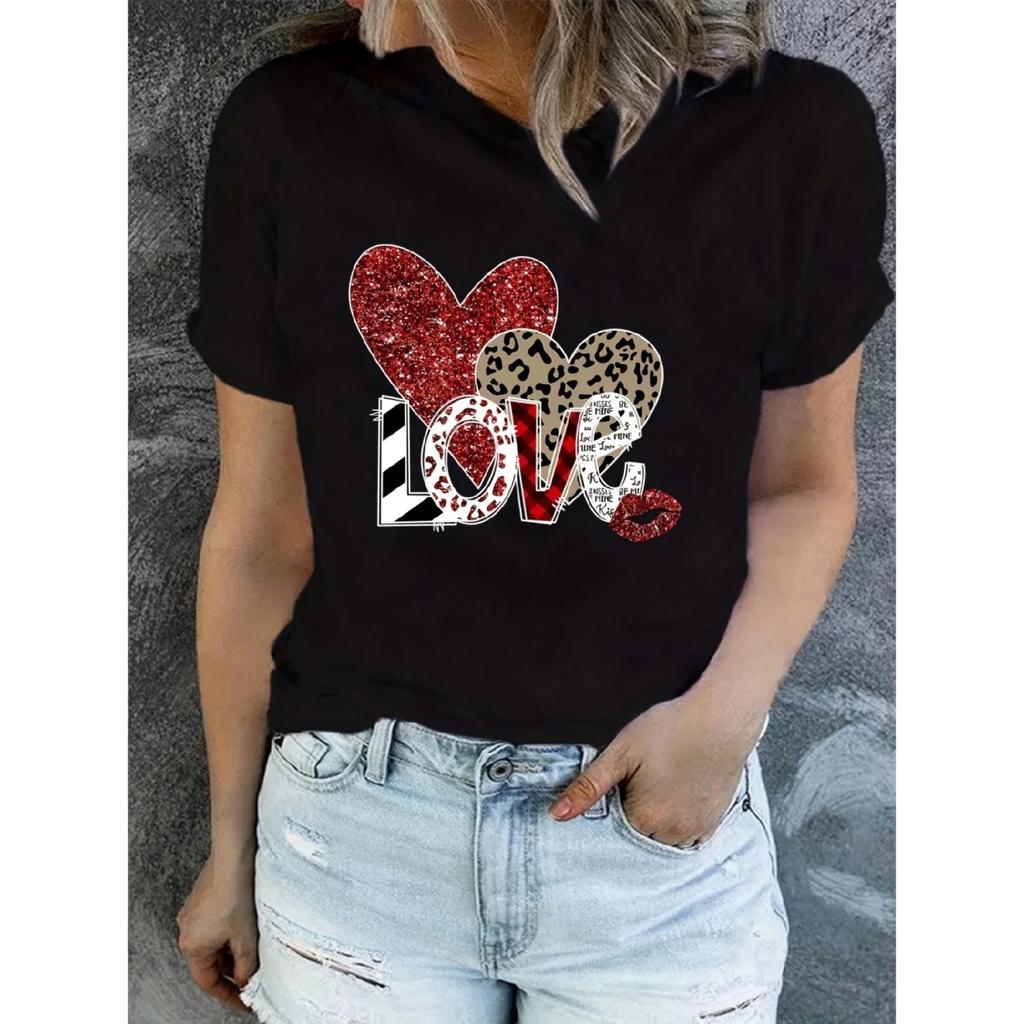 2024 Große Größen Damen LOVE Liebe Druck Damen Rundhals Baumwolle Oberteil Kurzarm Shirt Lässig Straße Vielseitige Kleidung T-Shirt