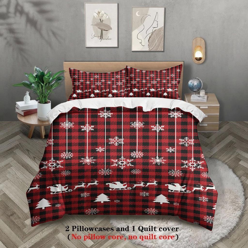 3-teiliges Bettbezug-Set mit Weihnachtsmotiv - Weicher, atmungsaktiver und hypoallergener Stoff - Kariertes Elch-Schneeflocken-Druckdesign, P
