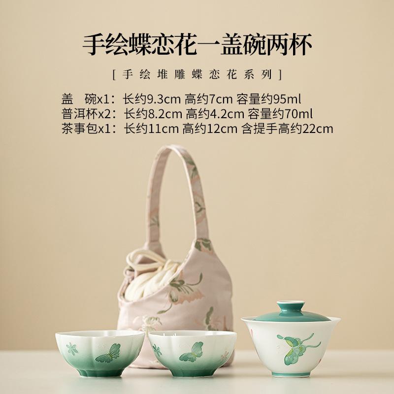 Handbemaltes Schmetterlings-Liebesblumen-Reise-Teegeschirr-Set Kit Japanisch 1 Kanne 2 Tassen Teebereiter Organizer Tragbare Outdoor-Handtasche Geschenk