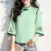 ZANZEA Damen Freizeit Stehkragen 3/4 Ärmel Blumenstickerei Bluse