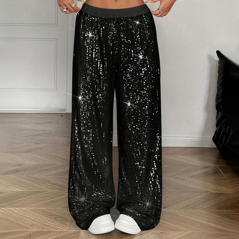 Damen Schwarz Pailletten Weite Hosen Elastischer Bund Glitzernd Locker Partyhosen