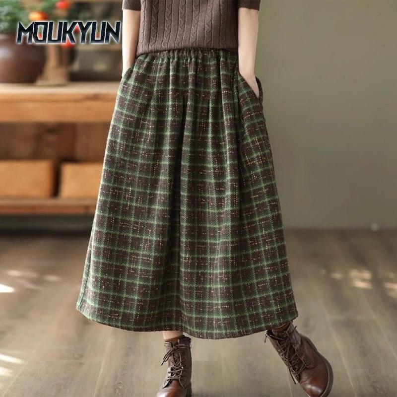 Vintage Karierte Midi-Röcke Damen Baggy High Waist A-Linie Dicker Französischer Stil Taschen Mujer Unterteile Mode Elegant