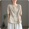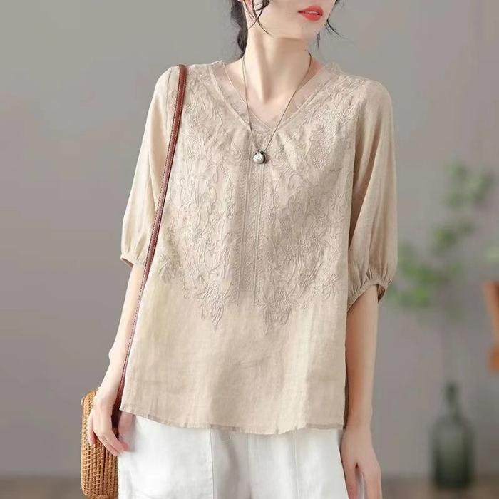 Retro Thin Blouse Women's Short-sleeved Shirt Summer Loose V-neck Temperament Cotton and Linen Shirt Apricot