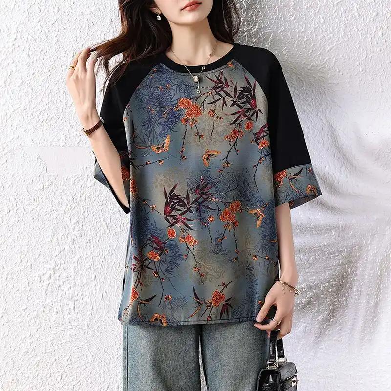 All-Match Mode Oberteil Damen Kurzarm Sommer Neu Locker Übergröße Damen Bedruckt Mittel bis Lang Rundhals T-Shirt