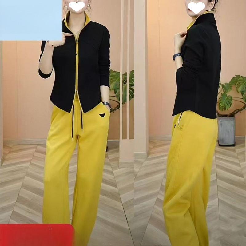Spring Fashionable Casual Sports Suit, Western-style Stand-up Collar, Long-sleeved Top, Straight-leg Trousers Two-piece Set