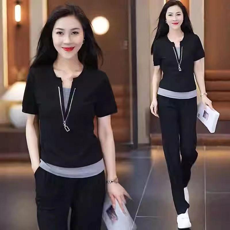 Short-sleeved Casual Sports Suit for Women, Summer Fashion, Age-reducing Vacation, Two-piece Top, Straight-leg Pants, Two-piece Set