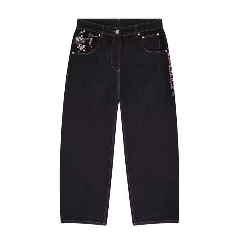 Herren Vintage Sakura Jeans Y2K Kleidung Harajuku Gothic Hip Hop Sakura Stickerei Baggy Jeans Schwarze Hose Weite Hosen