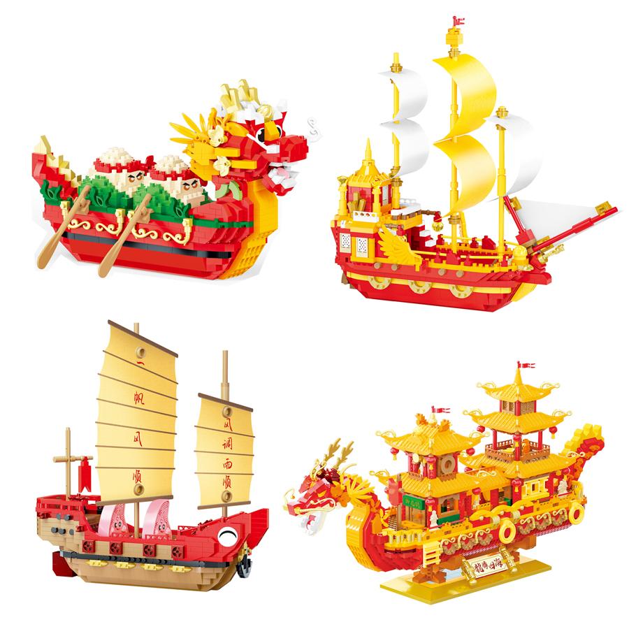 Chinesisches Neujahrsdeko Drachenboot Bausteinspielzeug Plastik Zusammengebaute Modelle Segelboot Glücksbringer Geschenkset