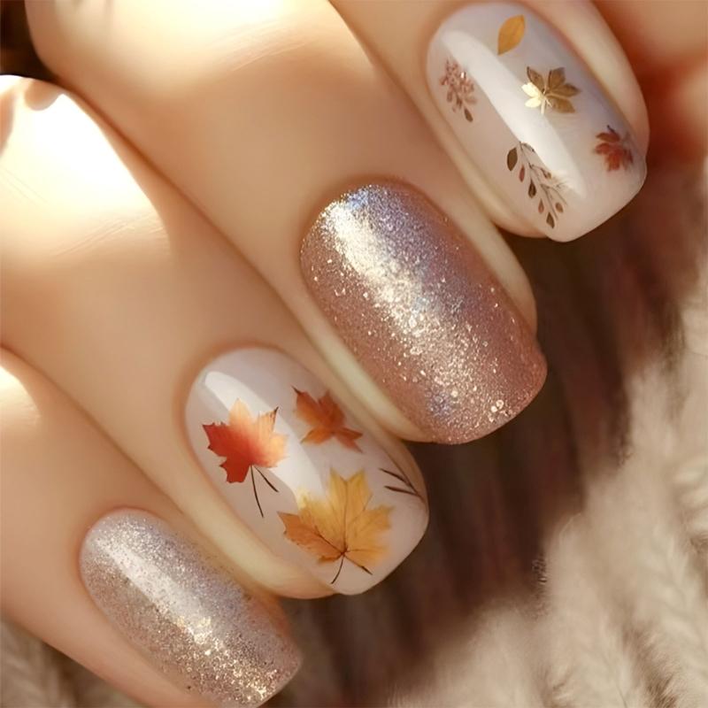 24pcs Autumn Maple Leaves Press On Nails Short Square Artificial Nails Stick on Nails For Thanksgiving Party