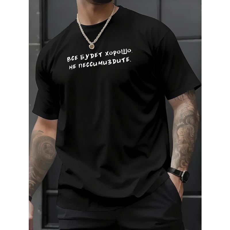 European sizes Men's Russian Cyrillic Text T-Shirt - Black with White Cyrillic Script & Russian Alphabet, Comfort Fit Short Sleeve Shirt