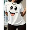 Europäische Größe Damen Niedliches Gesicht Druck T-Shirt mit Ausdrucksstarken Augen & Lächeln - Weiches Stretch Rundhals Kurzarm Top, Ganzjahres Freizeitkleidung