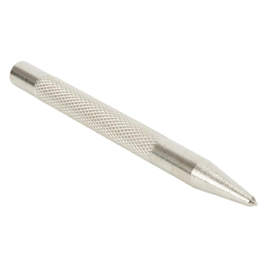 Knurled center punch tool made of hardened carbon steel for creating precise dots and marks on metal workpieces before drilling