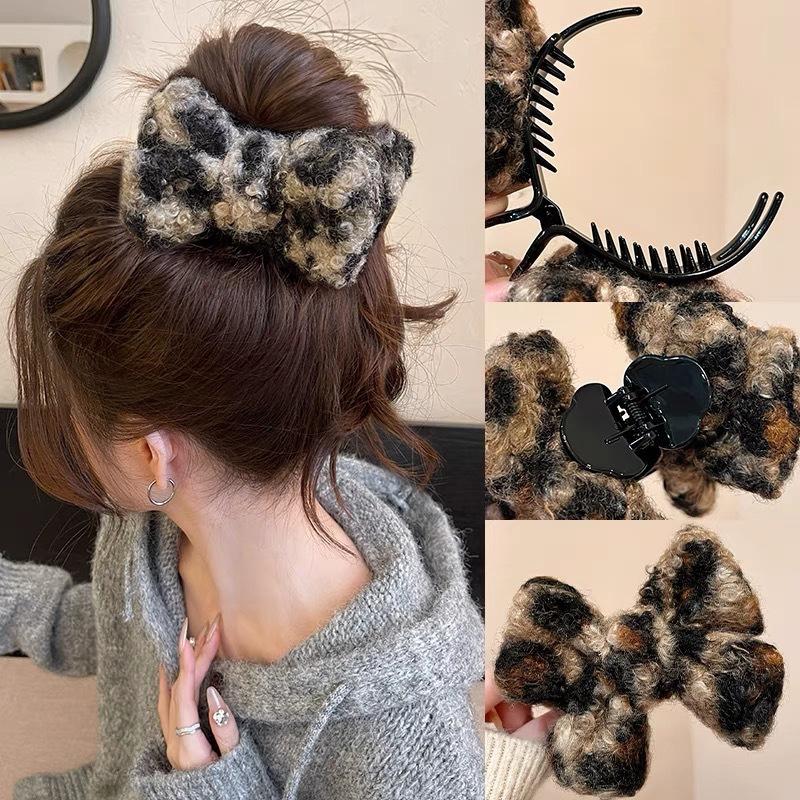 Coffee leopard print double-sided plush bow leopard print hairpin retro style shark clip hair accessories