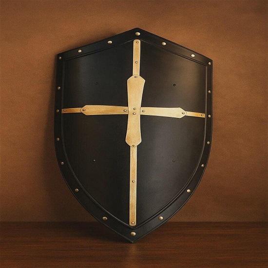 Dieser handgefertigte mittelalterliche Wand Schild wird mit Liebe zum Detail gefertigt und spiegelt die Stärke und das Prestige ritterlicher Rüstungen wider.. Die solide Konstruktion sorgt für Langlebigkeit, während die dekorativen Messingarbeiten sein königliches Aussehen aufwerten.. Der Schild ist sorgfältig gearbeitet, um ihm ein gealtertes, kampferprobtes Aussehen zu verleihen, was ihn perfekt für Liebhaber mittelalterlicher Dekoration und Sammler macht.