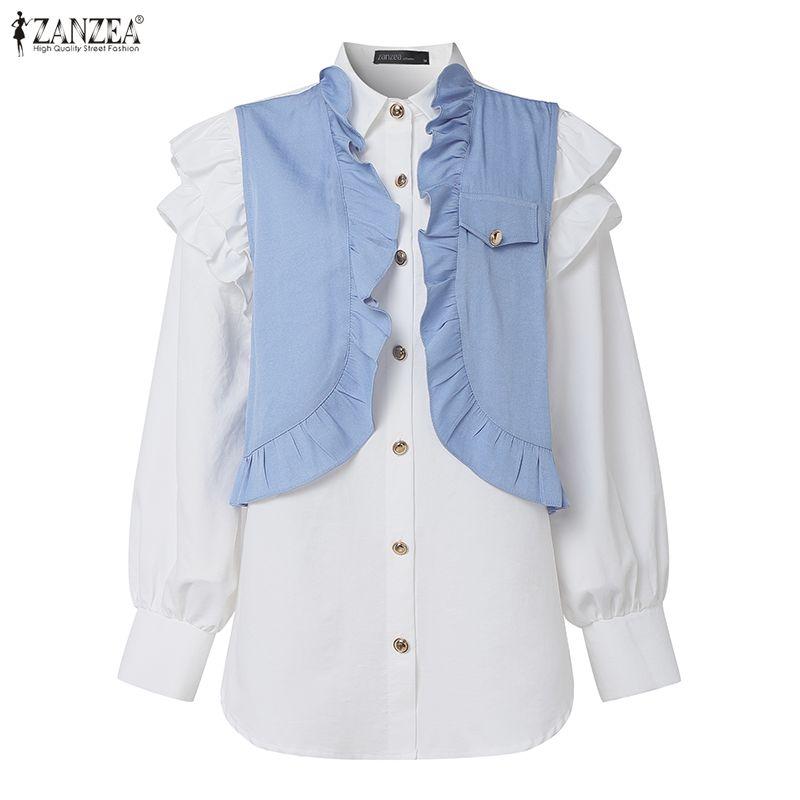 ZANZEA Women Casual Turn Down Collar Long Sleeve Patchwork Blouse