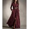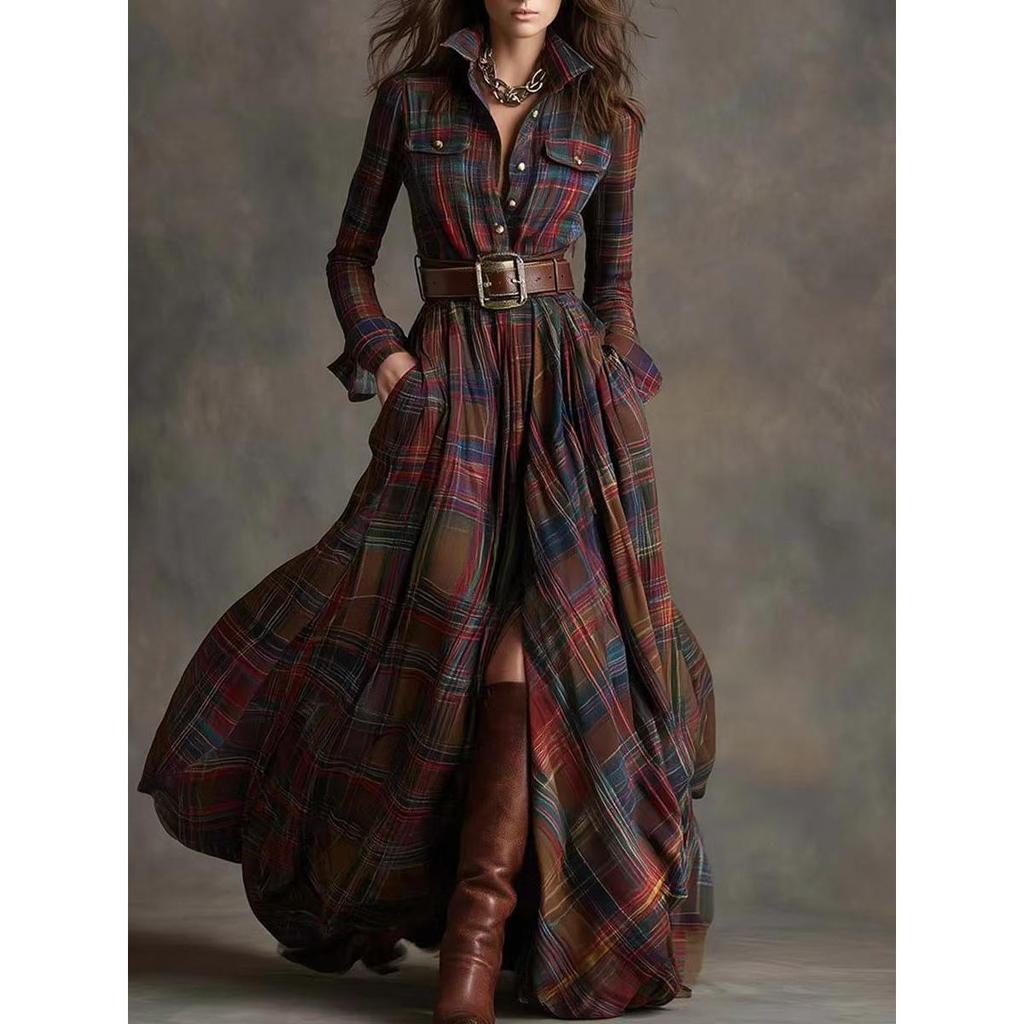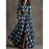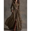 Französische Retro Karodruck Schlitz Lange Kleider Frau Elegant Umlegekragen Knopf Maxi Kleid Herbst Langarm Tasche Boho Kleid