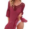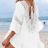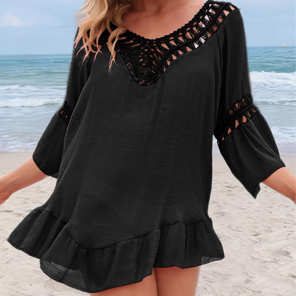 Hand-painted Hollowed-out Stitched Ruffled Edge Three-quarter Sleeve Irregular Beach Skirt Blouse for Women