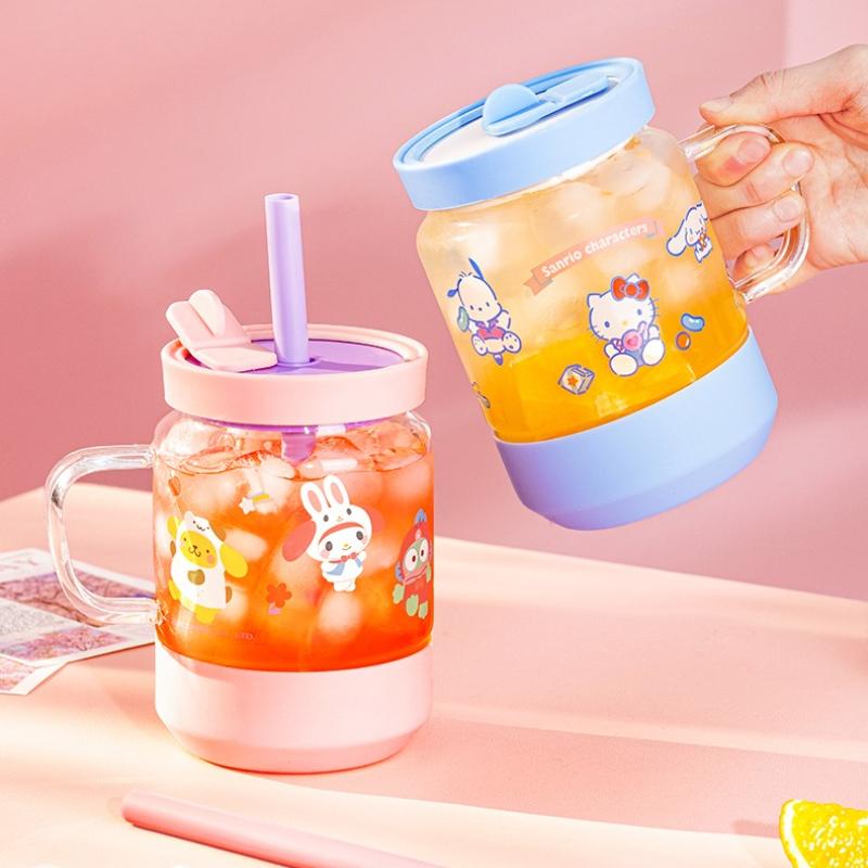 For Sanrio Straw Glass Cup High Borosilicate Glass Coffee Milk Mug Cartoon Juice Oat Cup with Heat-resistant Silicone Cup Sleeve