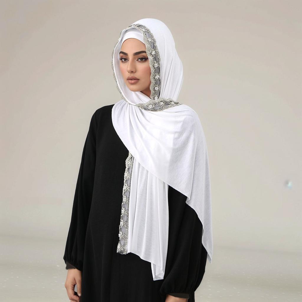 Pearls Embroidery Cotton Jersey Muslim Hijab Long Scarf Women Head Wraps Shawl Turban Eid Soild Headband Malaysia Tudung 170*60C
