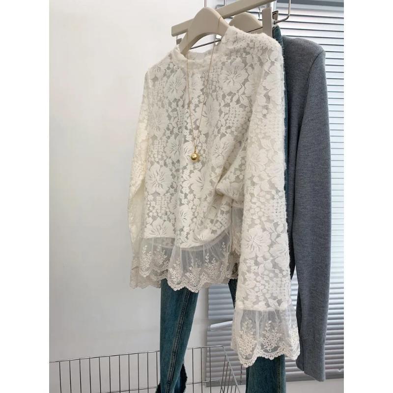 Spitzen-Langarm-Damen-High-End-Leichtluxus-Altersreduzierendes und Stilvolles Neues Design Nischen-Oberteil