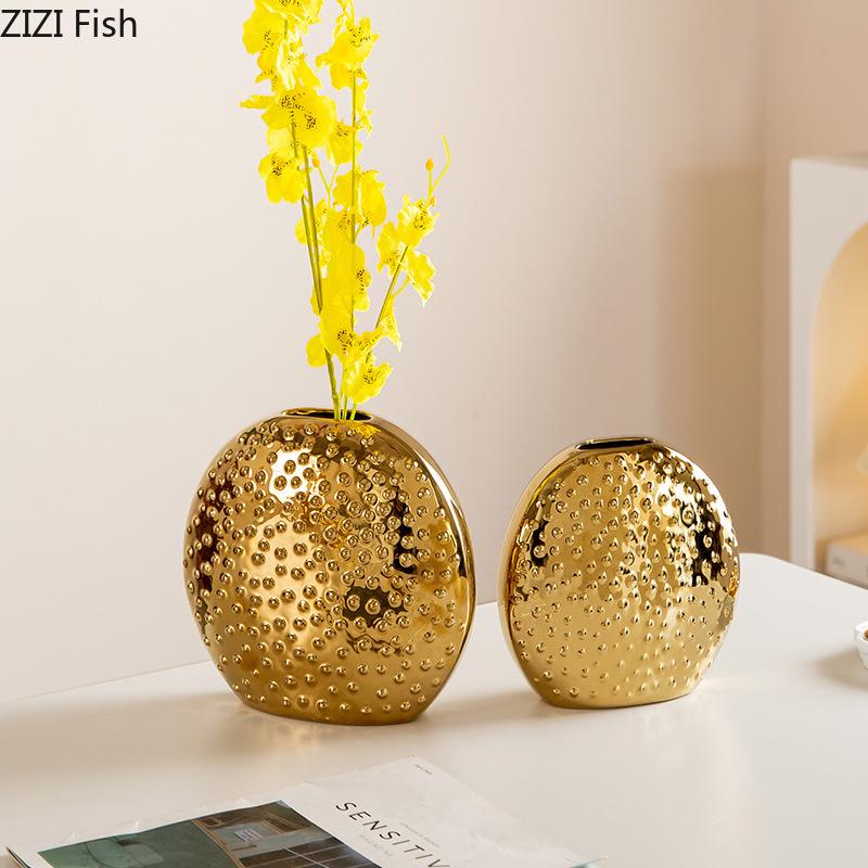 Gold Plated Spikes Ceramic Vase Round Floral Plant Pots Table Decoration Flowers Arrangement Flower Vase Room Aesthetic Decor