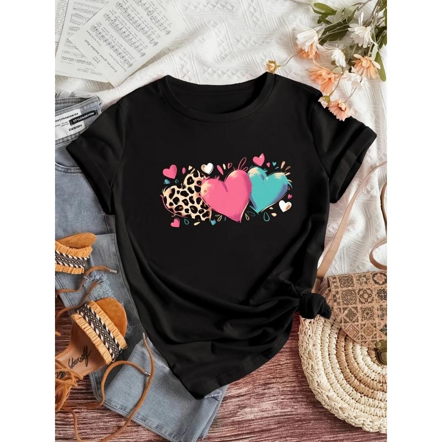 Herzbedrucktes Rundhals-T-Shirt Kurzarm Damen Lässige Oberteile Frühling_Sommer Kleidung Sommer Streetwear Grafik-T-Shirts Y2K
