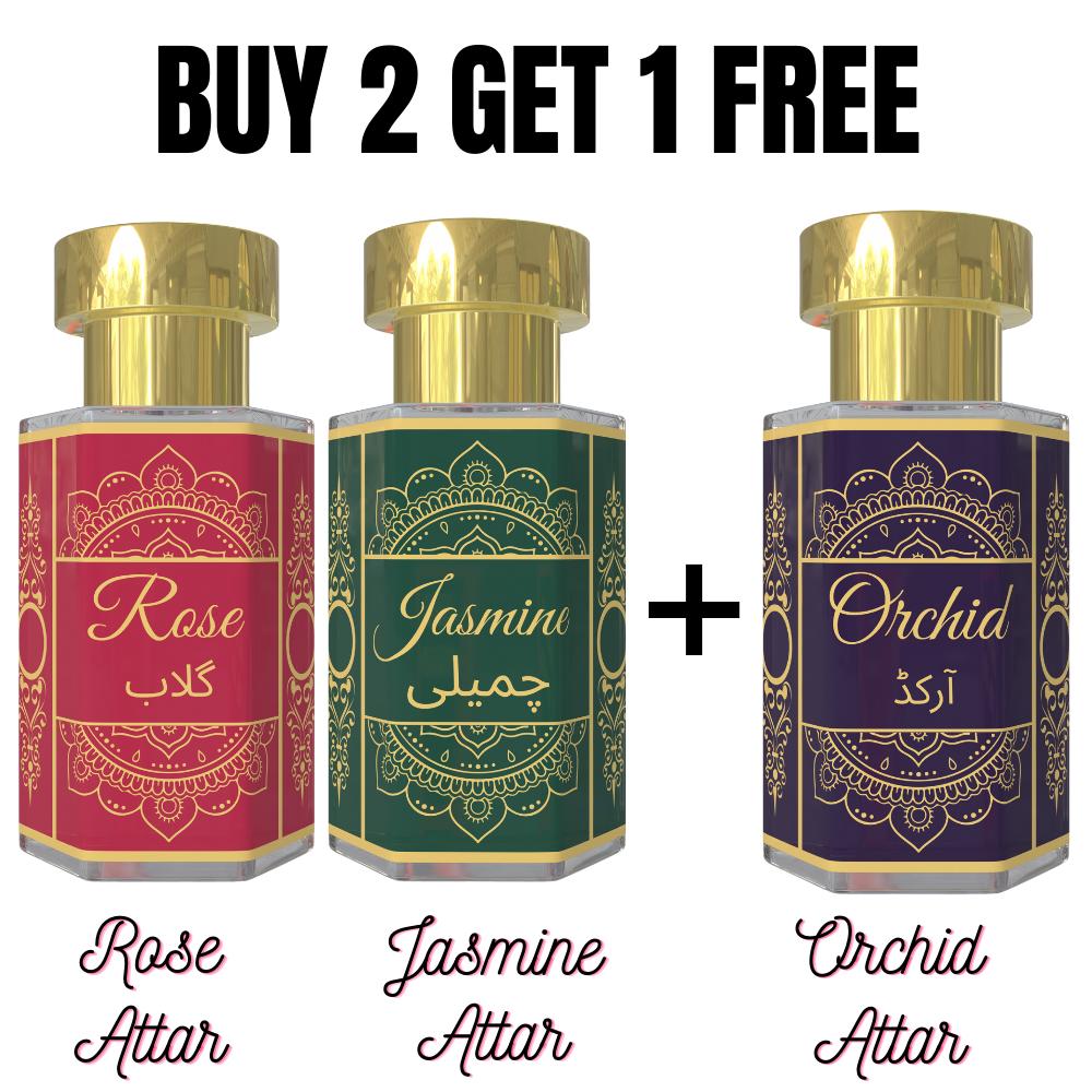 • Kombination aus Rose, Jasmin und kostenlosem Orchideen-Attar