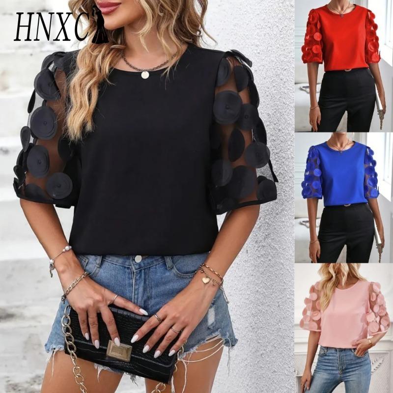 HNXC Damenmode, lässig, einfarbig, mit Druck, kurzärmelig, Rundhalsausschnitt, Blusen & Hemden
