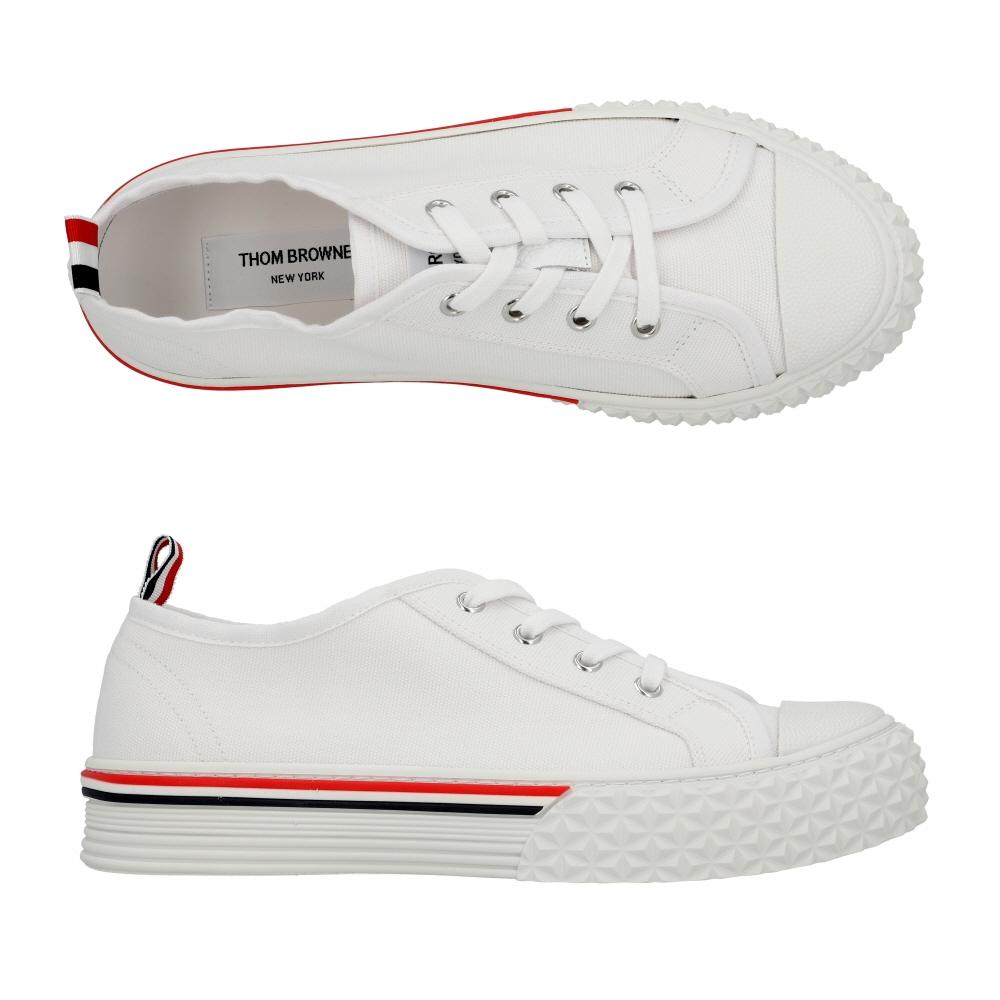This collegiate sneaker features Thom Browne's signature stripe and is made of organic canvas for a low-top sneaker style. The tartan tread sole design provides a casual wearing experience, while the grosgrain loop tab emphasizes the brand identity. Using premium materials ensures durability and stylishness.