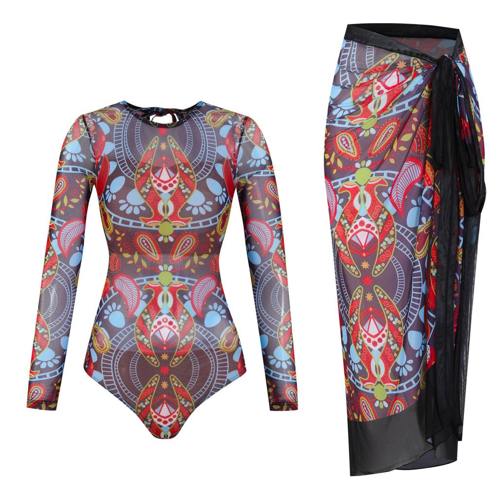Einteiler, Feminines Retro-Netz-Badeanzug-Set, Zweiteiliger Langarm-Einteiler, Urlaubs-Badebekleidung.