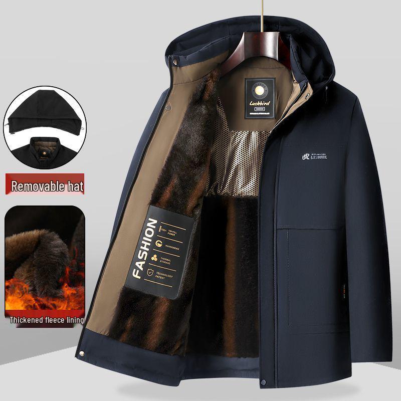 Erleben Sie Komfort und Stil in den kühlen Monaten mit dieser Herren-Winter-Baumwolljacke. Gefertigt aus hochwertigem Leinenmaterial, ist diese dicke und warme Jacke darauf ausgelegt, der Kälte zu trotzen, und somit eine unverzichtbare Ergänzung für die Garderobe jedes Mannes mittleren Alters oder Vaters.. Mit einer abnehmbaren Kapuze aus Flachs-Pelz bietet es Vielseitigkeit und zusätzliche Wärme bei Bedarf, während sein klassisches Design dafür sorgt, dass es perfekt zu verschiedenen Outfits passt.. Diese Jacke ist ideal, um dem Winterwetter stilvoll zu trotzen, und ein Muss für alle, die Wert auf Qualität und Funktionalität bei ihrer Oberbekleidung legen.