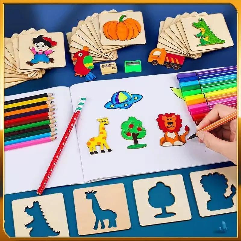 Zufällige 32 Stück Kinder Holz Zeichenspielzeug DIY Malvorlagen Schablone Bastelspielzeug Puzzle Lernspielzeug für Kinder Geschenke
