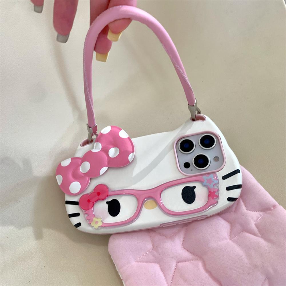 3D Hello Kitty Brille Niedliche Rosa Schleife Süße Handyhülle Für iPhone 16 15 14 13 12 11 Pro Max 16 PLUS Handschlaufe Kordel Rückseite