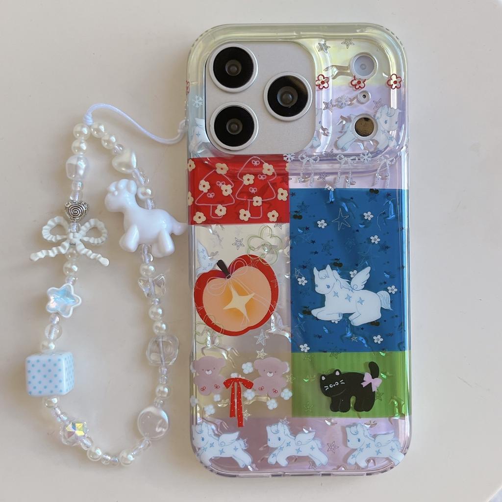 Kawaii Patchwork Einhorn & Katze Muster Perlen Pony Anhänger Riemen Handyhülle für iPhone 17 16 15 14 11 12 13 Pro Max Plus Rückseite