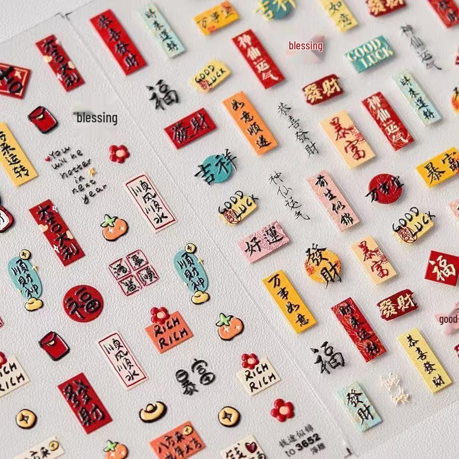 Gold Stamped Calligraphy Hanzi Nail Art Stickers: Embossed Persimmon Ruyi, Congratulations, Good Luck & Wealth
