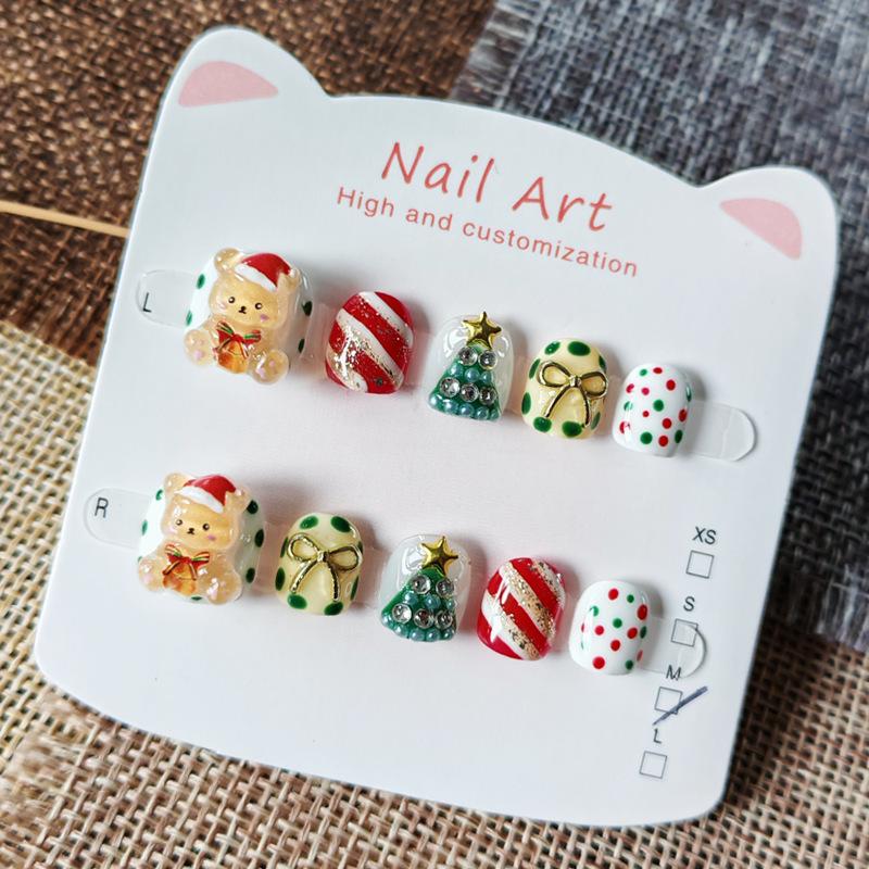 Handmade Wearable Christmas Bear Nail Stickers for Kids Ages 3-12 - Cute Cartoon Design