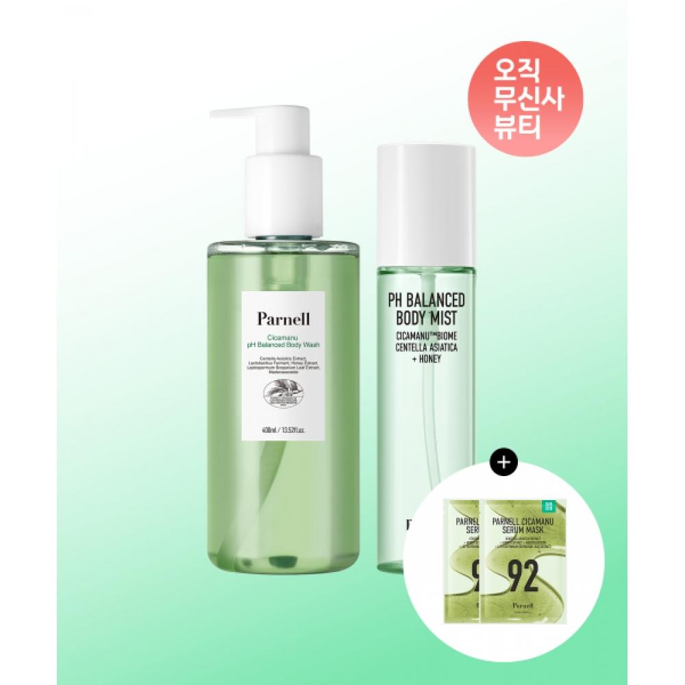 PARNELL CICA MANU Körperwaschmittel mit niedrigem pH-Wert 400 ml + Spray 150 ml (+ Serum Maske 2 Stück) ist dazu bestimmt, gereizte Körperhaut zu beruhigen und zu regenerieren. Dieses Set enthält PARNELLs einzigartiges 'CICA MANU™ Biome', das den Hautzustand verbessert und gesunde Haut fördert.