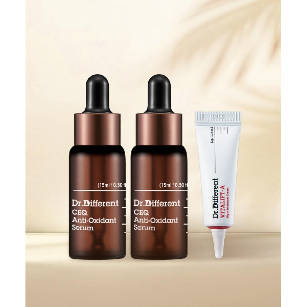 DR.DIFFERENT ist eine Hautpflegemarke, die nur die besten Inhaltsstoffe zur Hautverbesserung auswählt und die Hautgesundheit mit ihren dreifachen Antioxidans-Komponenten stärkt.: Vitamin C, Vitamin E und Coenzym Q10.