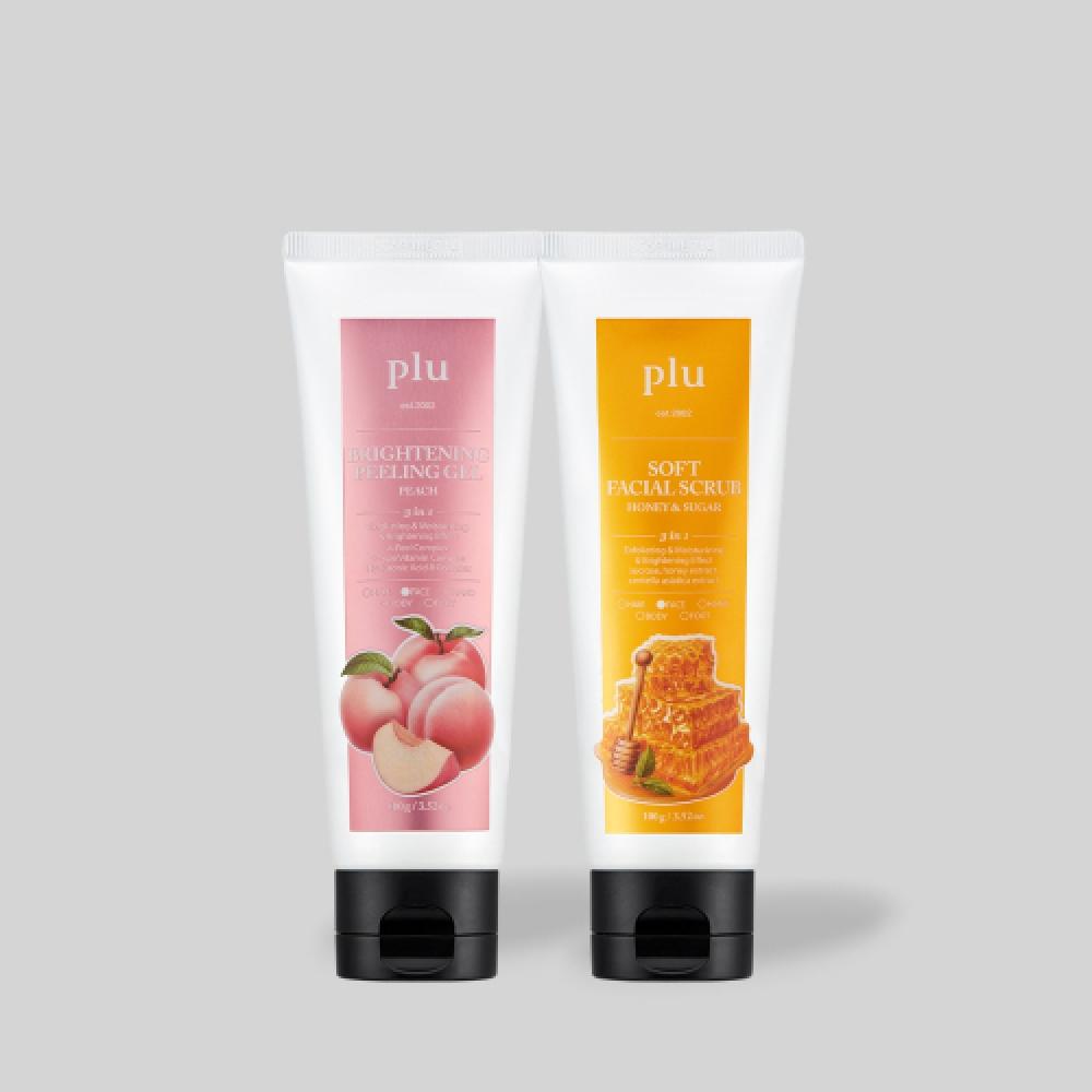 PLU Soft & Brightening Facial Scrub 100g 2pcs is a scrub that gently removes skin keratin and impurities. This product contains honey extract and sugar scrub particles, providing moisturizing, brightening, and tone-up effects. Suitable for all skin types, it features a soft texture that promotes a smooth and bright complexion without irritation.