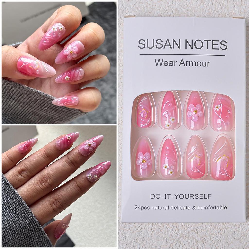 3D Glue Drip Flower Nail Art: 24 Skin-Brightening, Light Luxury Almond-Shaped Wearable Fake Nails