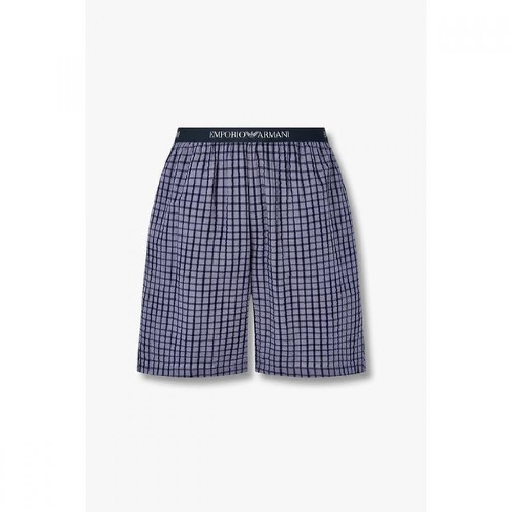 The Emporio Armani Men's Check Pattern Lounge Shorts (0815331006) features a dark blue color with a check pattern design and an elastic waistband. With side pockets, it enhances practicality and provides comfortable wear suitable for leisure time. This lounge shorts is designed as an item that can be casually worn indoors.