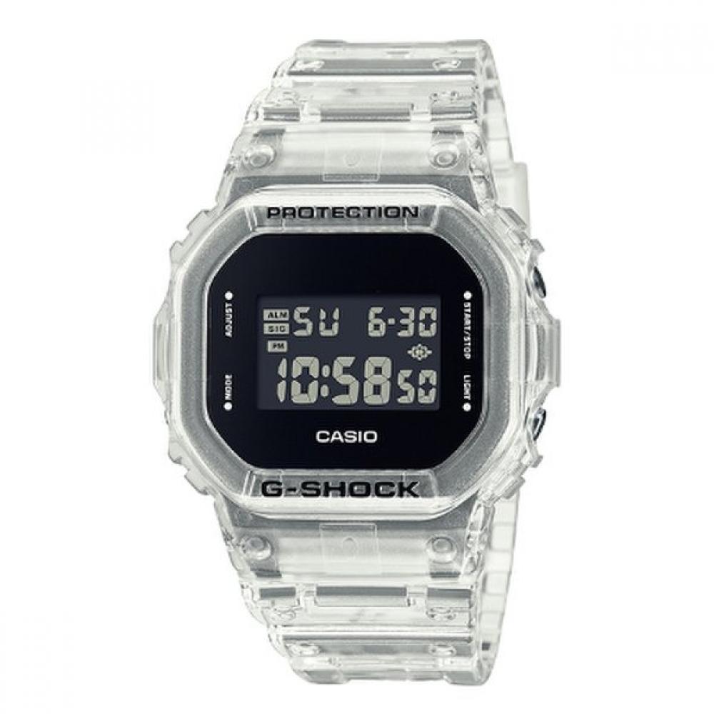 DW-5600USKE-7DR is part of the G-SHOCK Skeleton series, constructed with transparent resin components. It features a clear type with a white base color, based on the original square model DW-5600, showcasing an elegant design. It offers a waterproof rating of 20 atmospheres (200m) and includes various alarm and stopwatch functions for convenient daily use.