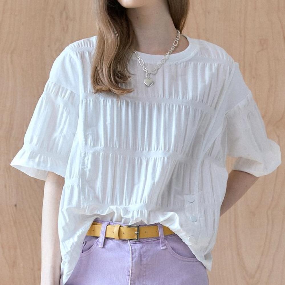 Die geprägte Bluse mit Knopfleiste und Raffung ist eine attraktive Bluse mit Rundhalsausschnitt und einer plissierähnlichen Prägung.. Es hat einen unterschiedlichen Saum vorne und hinten, mit Knöpfen und diagonalen Linien auf dem Rücken, die eine einzigartige Stimmung erzeugen.. Die überschnittenen Schultern und die lockere Passform ermöglichen einen raffinierten Look.