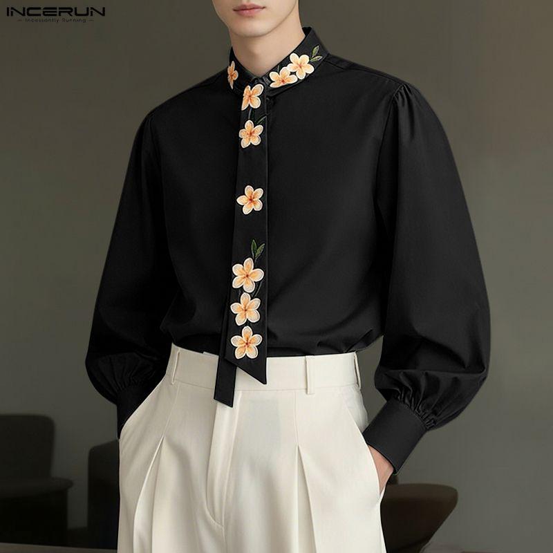 INCERUN Men Lapel Neck Long Sleeve Tie Up Buttons Up Floral Print Casual Shirts